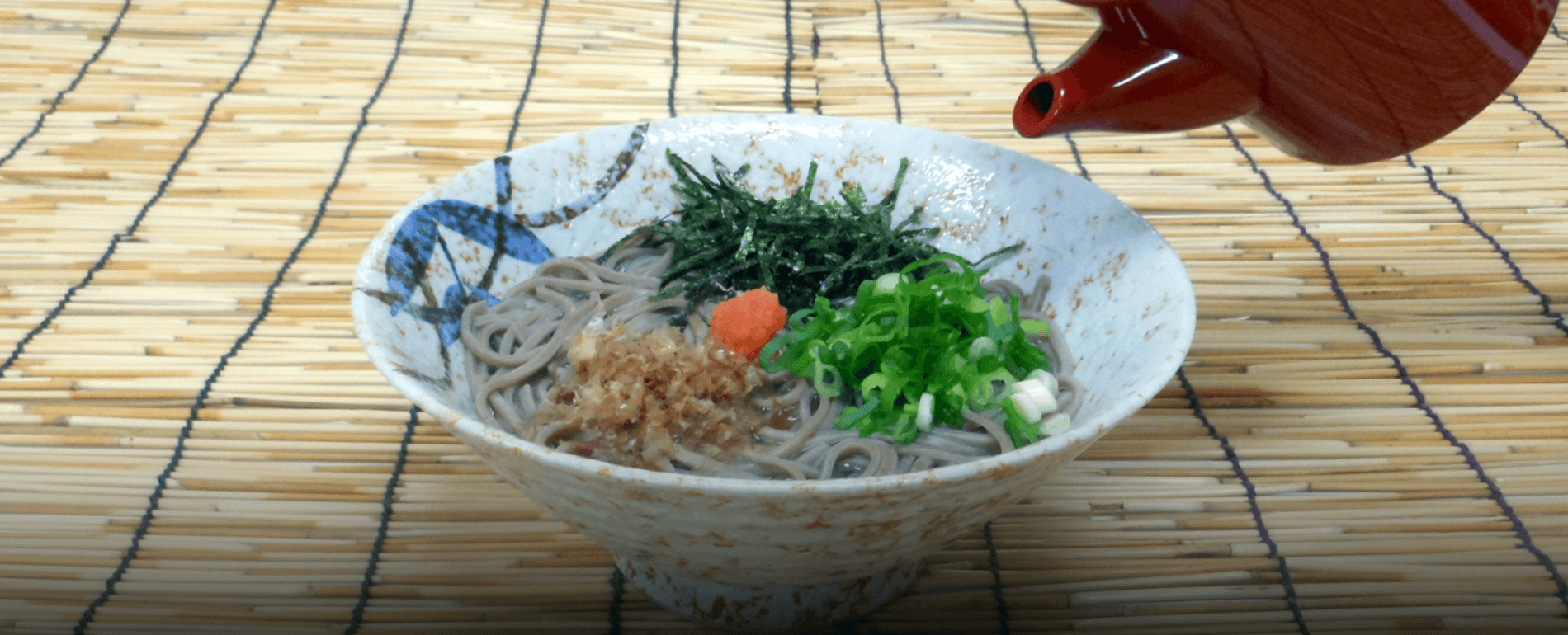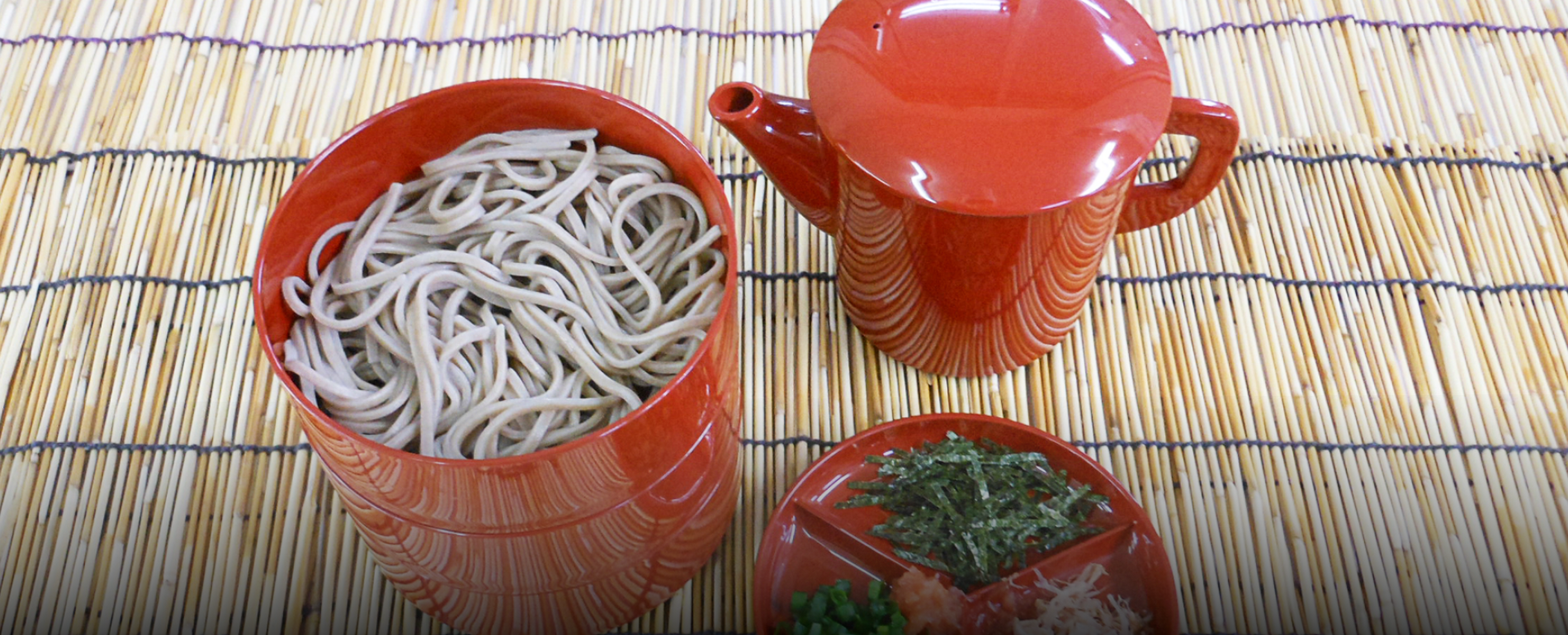 また、「割子そば」は直径12センチほどの朱塗りの丸い容器にそばを盛り、だしを直接そばにかけて食べます。一方「釜揚げそば」はゆでたそばとゆで汁(そば湯)直接器に入れ、つゆと薬味をお好みで加えて食べる温かいそばです。
