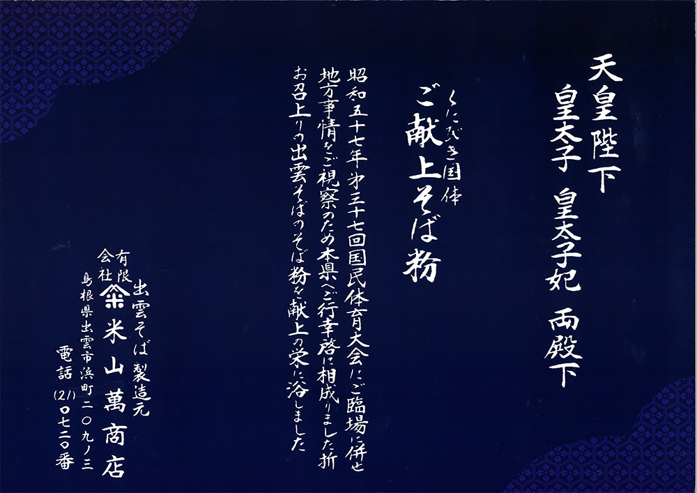 天皇陛下に当社そば粉献上の栄誉に与りました。
