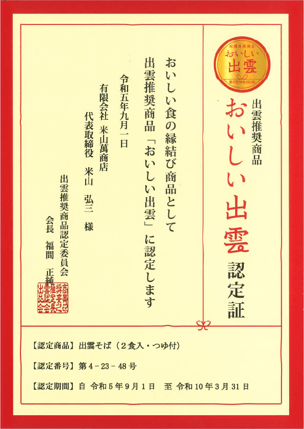 【出雲推奨商品認定委員会】よりおいしい出雲認定証を受けました。